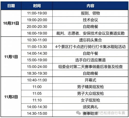 11月1日将率先开展骑行打卡活动,200名选手从“遗忘码头”出发,完成指定打卡任务。11月2日则为正式竞技赛事,各组选手从景区大门出发,沿环湖路线骑行,途经湖心岛、结巴村,最终返回起点。