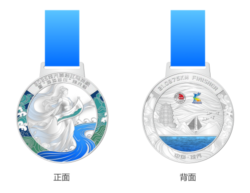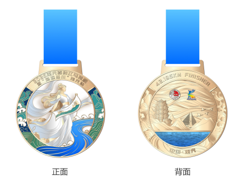 完赛奖牌:以“丝绸女神”为核心意象,融入嘉陵江浪花、白塔、嘉陵江大桥等城市地标,用蓝金配色区分项目(马拉松金色、半程马拉松银色),打造“移动城市名片”;
