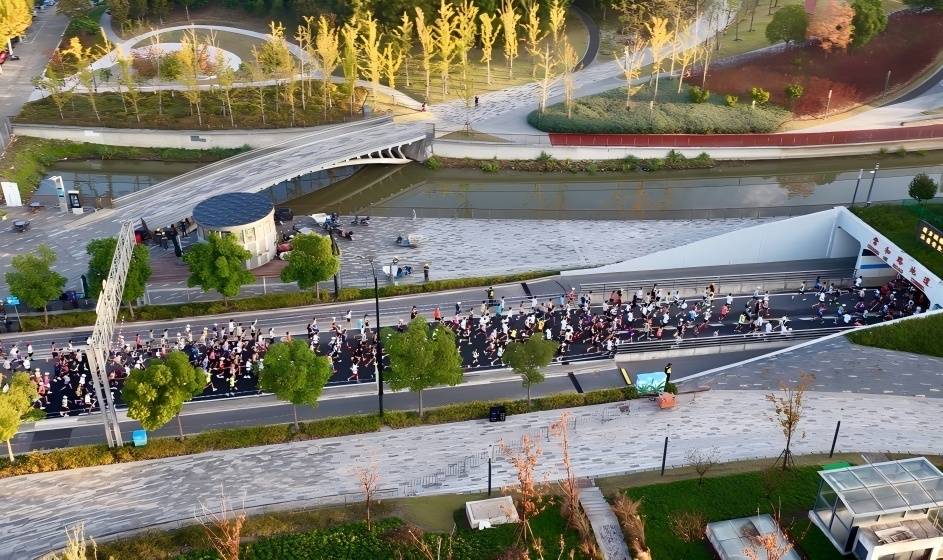 赛道以TOP中央公园为起点,串联桃浦智创城、祁连山路景观大道、英雄金笔厂旧址、金环广场、国金体育中心等普陀地标,沿线风光旖旎,现代城市景观与工业文明遗存相映成趣,跑者们用脚步丈量了普陀的城市发展脉络,亲身体验普陀区的卓越建设成果。